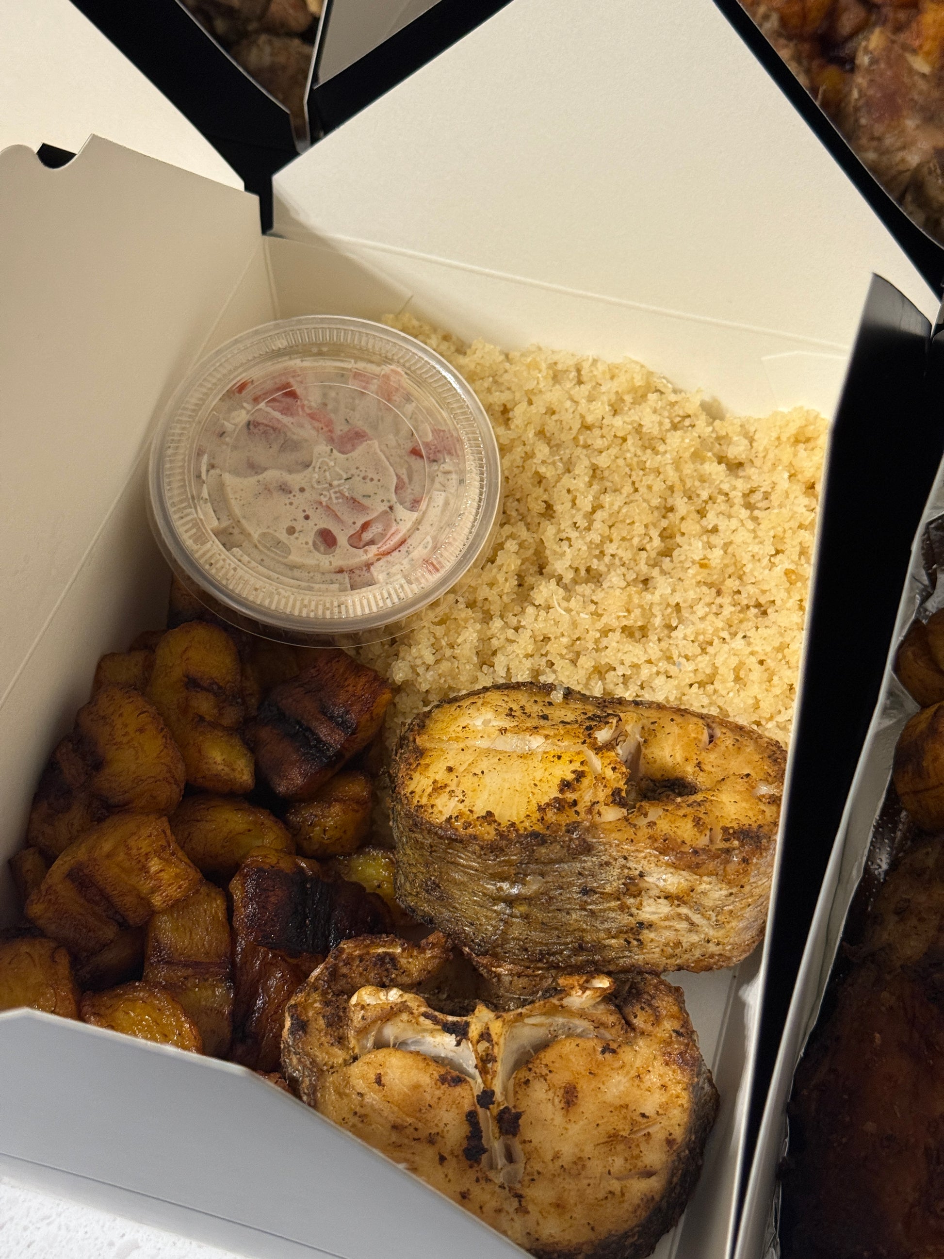 Notre combo poison comprend du poisson frit avec des bananes plantains + un deuxième accompagnement au choix parmi: